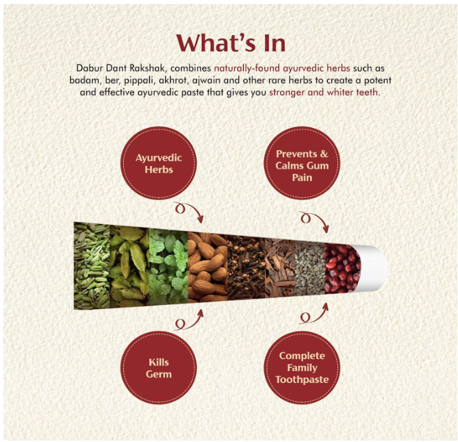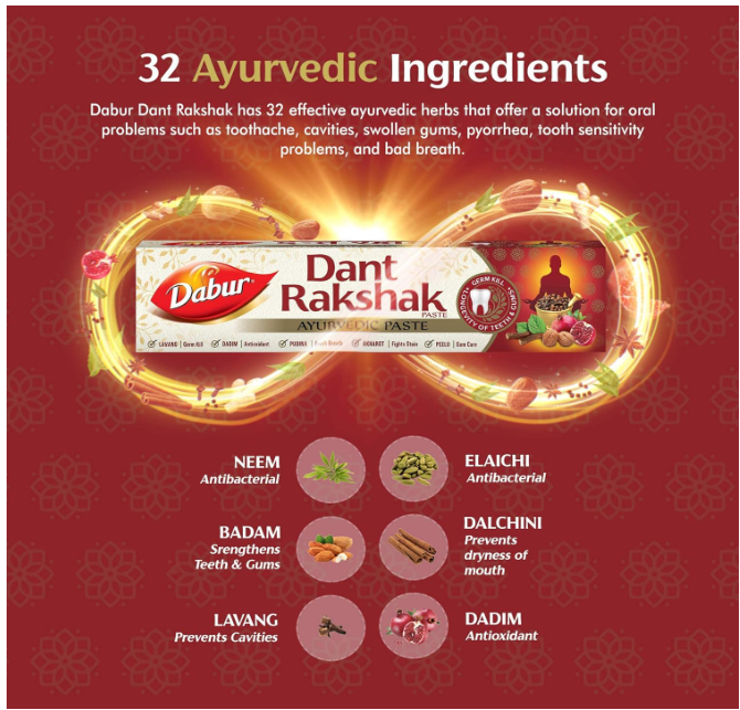 About this item 32 Ayurvedic Herbs: Dabur Dant Rakshak has 32 potent & effective ayurvedic herbs Kills Germs for Longevity of Teeth & Gums: The unique ayurvedic herbs present in Dabur Dant Rakshak kills germs and gives longevity to your teeth & gums Each herb present has its own benefits like Lavang - helps kill germs, pudina - gives fresh breath, Akharot - fights stains, Dadim - Antioxidant, Peelu - Gum Care